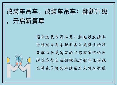 改装车吊车作为一种经过改造和升级的专用车辆,具备了更强大的吊装能力和更高效的工作效率。它在建筑施工、物流运输等领域发挥着重要的作用。未来,随着技术的不断进步和需求的不断增长,改装车吊车将更加智能化、环保节能,为各行各业的发展带来更多的便利和效益。